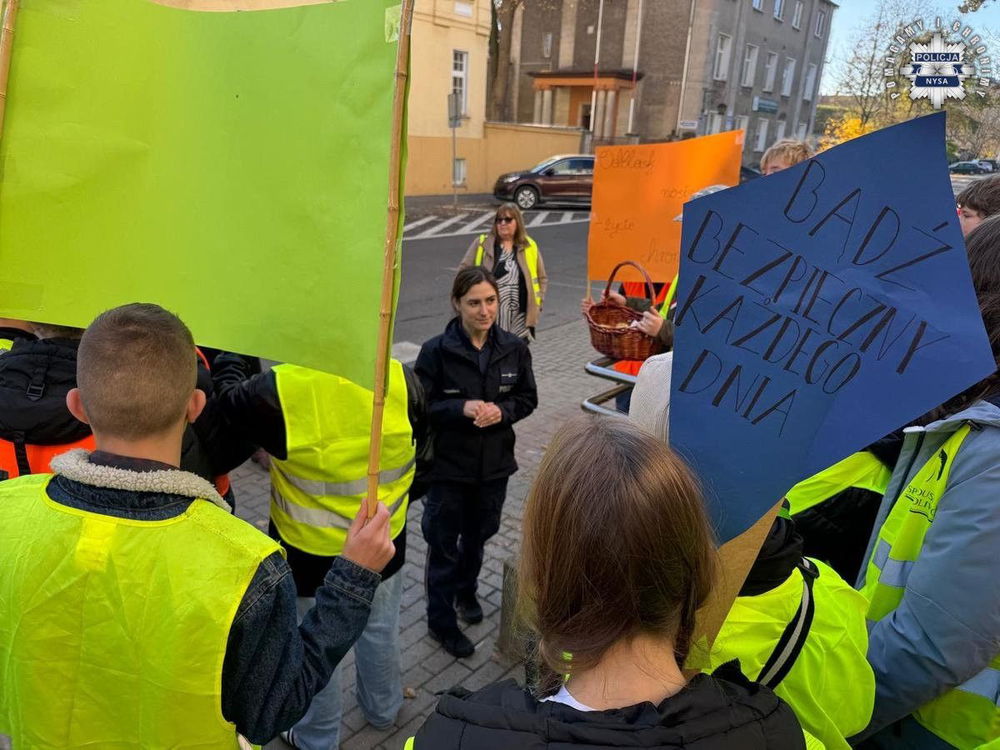 Z transparentami i w kamizelkach odblaskowych uczniowie Szkoły Podstawowej nr 1 im. Kawalerów Orderu Uśmiechu w Nysie odwiedzili Komendę Powiatową Policji. Następnie wyruszyli na spacer po centrum miasta, promując bezpieczeństwo pieszych i znaczenie elementów odblaskowych.