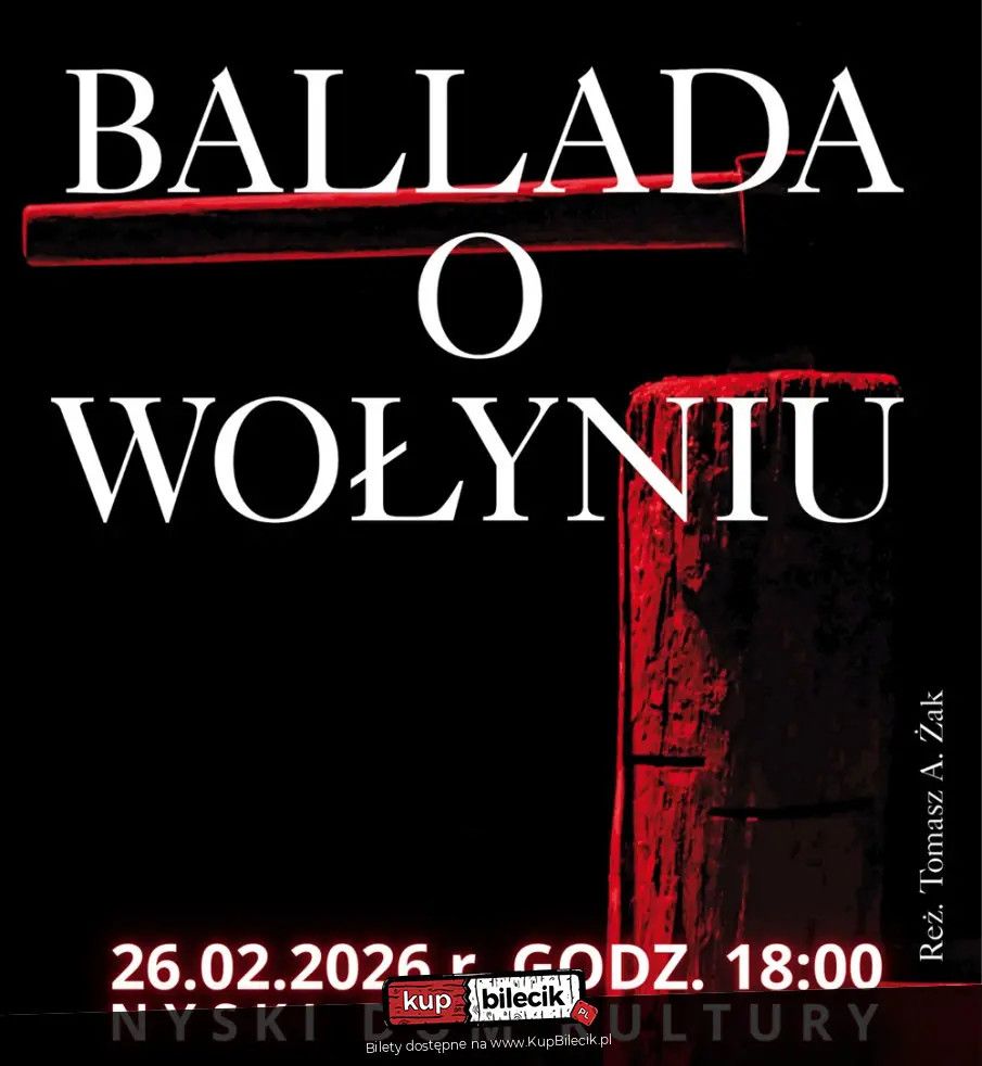 | Ballada o Wołyniudodano 2026-02-25 19:13:07 Spektakl Teatru Nie Teraz "Ballada o Wołyniu" to pierwsze w Polsce przedstawienie teatralne, który opowiada o ludobójstwie popełnionym przez nacjonalistów ukraińskich na polskiej ludności zamieszkałej na terenach południowo-wschodnich województw II RP w latach II wojny światowej. Ten niezwykle trudny temat, przez całe dziesięciolecia był przemilczany, a obecnie wciąż czeka na swą pełną obecność w świadomości Polaków. Jest równie ważny jak pamięć Powstania Warszawskiego czy pamięć o pokoleniu Żołnierzy Wyklętych. Scenariusz spektaklu korzysta z wątków legendarnej książki wielkiego polskiego pisarza Włodzimierza Odojewskiego "Zasypie wszystko, zawieje". Wykorzystywane są także oryginalne świadectwa osób, które przeżyły Zagładę Polaków na Kresach oraz stare pieśni, w tym melodia ukraińska ze współczesnymi słowami Bogny Lewtak-Baczyńskiej. Bilety do nabycia na: KupBilecik.plBallada o Wołyniu artyści: Teatr Nie TerazSpektakl Teatru Nie Teraz "Ballada o Wołyniu" to pierwsze w Polsce przedstawienie teatralne, który opowiada o ludobójstwie popełnionym przez nacjonalistów ukraińskich na polskiej ludności zamieszkałej na terenach południowo-wschodnich województw II RP w latach II wojny światowej. Ten niezwykle trudny temat, przez całe dziesięciolecia był przemilczany, a obecnie wciąż czeka na swą pełną obecność w świadomości Polaków. Jest równie ważny jak pamięć Powstania Warszawskiego czy pamięć o pokoleniu Żołnierzy Wyklętych. Bilety do nabycia na: KupBilecik.pl |